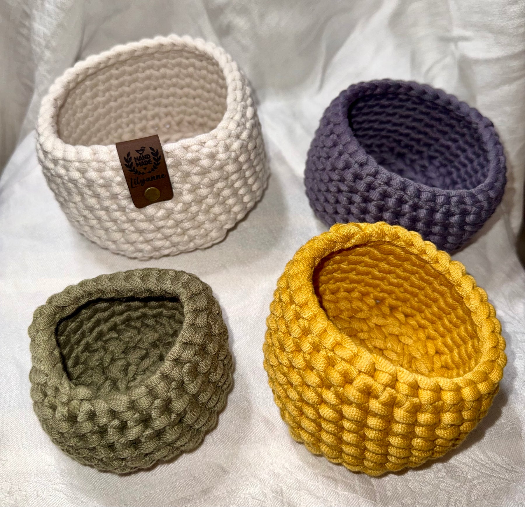 Add warmth and texture to your home with this set of four hand-crocheted stackable baskets, thoughtfully crafted to combine beauty and everyday practicality. Made from durable 100% polyester cord, these baskets are soft yet structured, making them perfect for organizing small essentials while adding a handmade touch to your space.