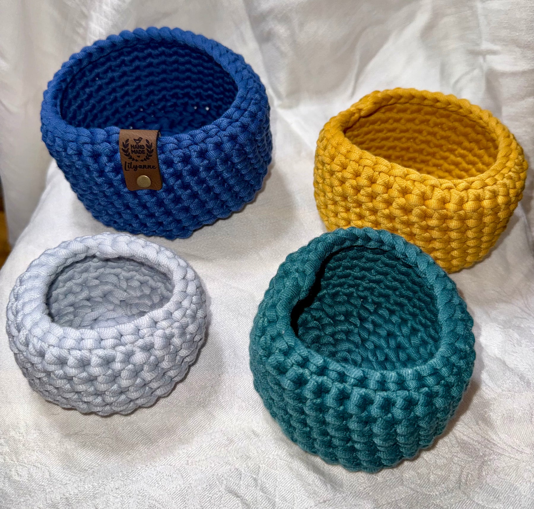 Add warmth and texture to your home with this set of four hand-crocheted stackable baskets, thoughtfully crafted to combine beauty and everyday practicality. Made from durable 100% polyester cord, these baskets are soft yet structured, making them perfect for organizing small essentials while adding a handmade touch to your space.