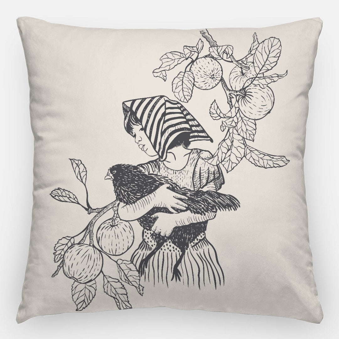 Tender and quietly nostalgic, the Gathered Kindness Pillow celebrates the beauty of care, simplicity, and everyday rural moments. The front features a finely detailed, hand-drawn illustration of a young girl gently holding a chicken, framed by fruiting branches and leaves. Rendered in classic black linework on a soft parchment ground, the scene recalls antique storybook illustrations and pastoral engravings—humble, intimate, and full of warmth.