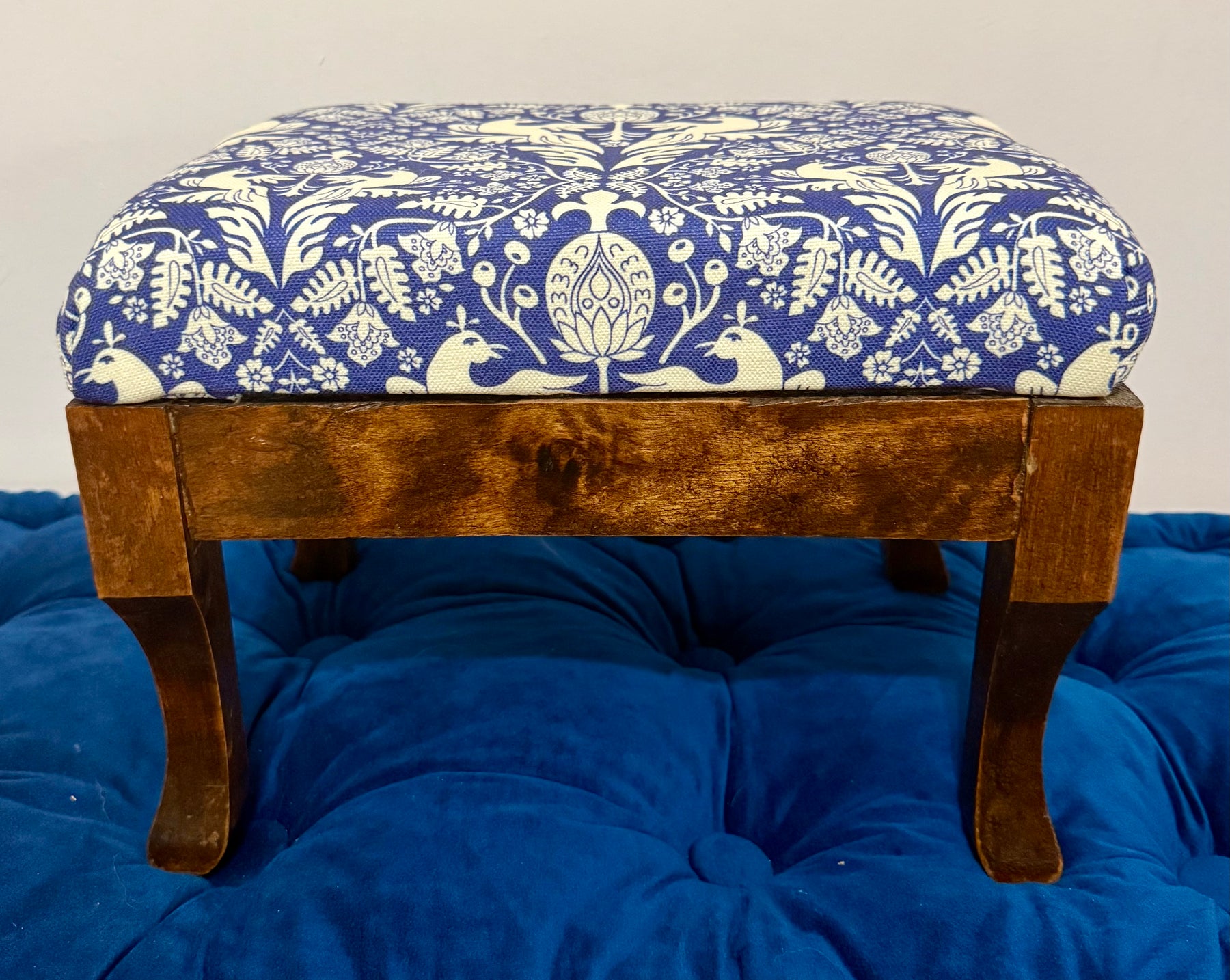 The cushioned top is finished in Lilyanne Design’s “Aviary Damask” performance linen, a bold blue-and-white pattern inspired by traditional motifs and designed to stand up to everyday use. The seat features a 2" foam cushion wrapped in cotton batting, offering both comfort and style in a compact size.