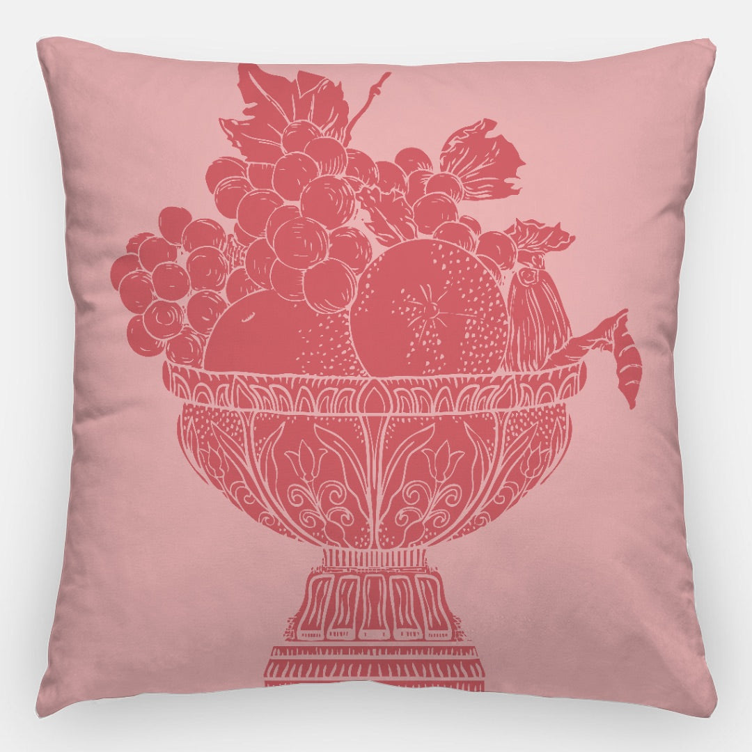 Rich with old-world charm and celebratory warmth, the Harvest Still Life Pillow brings a sense of abundance and tradition to your home. The front showcases a striking, hand-rendered illustration of an ornate compote overflowing with fruit—grapes, citrus, and gathered leaves—reminiscent of classical harvest engravings and antique still-life prints. Rendered in deep red against a soft blush ground, the artwork feels both bold and timeless, offering a refined focal point for any space.