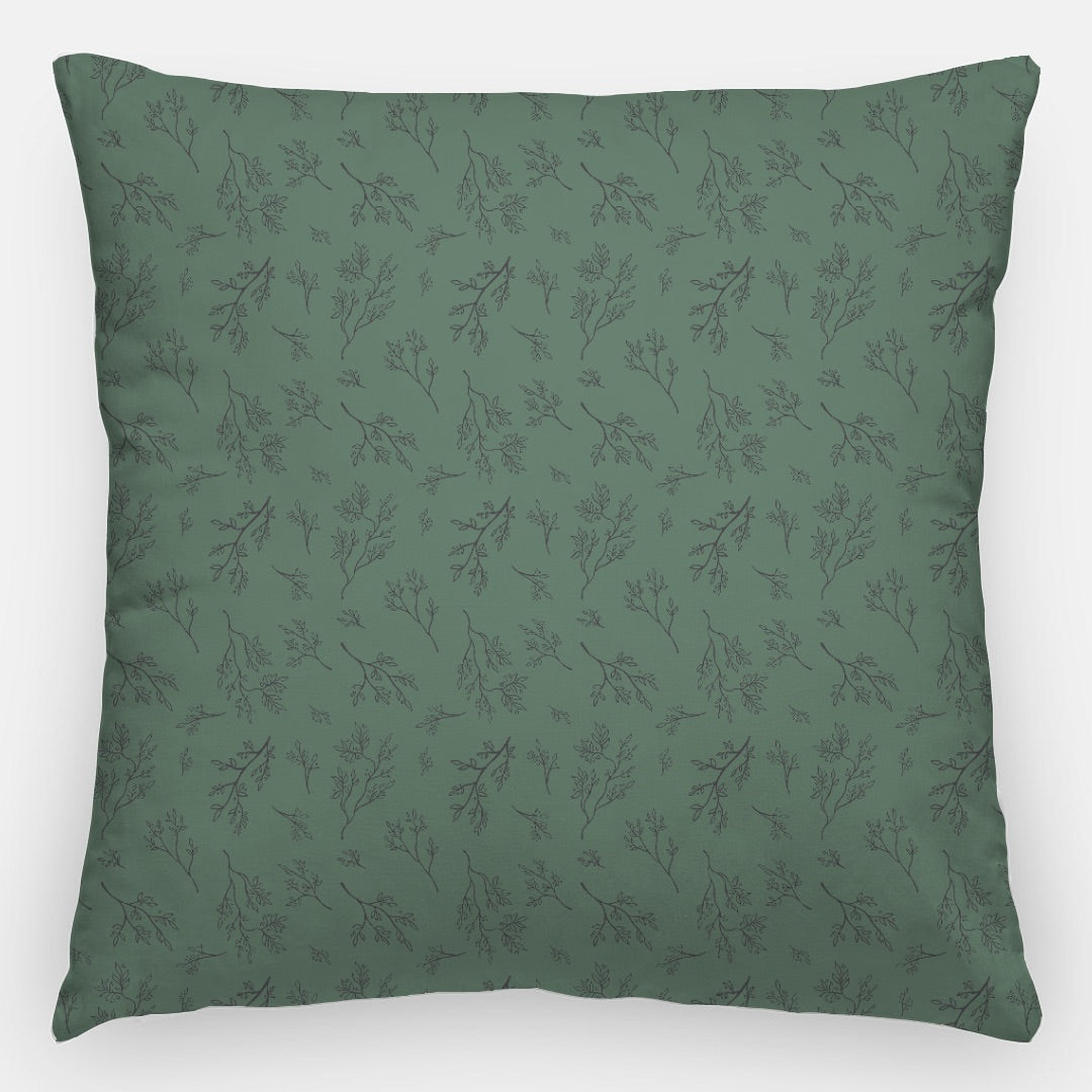The reverse side features the Field Cuttings pattern, a delicate allover design of scattered botanical sprigs in coordinating green tones. Subtle and rhythmic, it provides a quieter counterpoint to the illustrative front, making this pillow versatile for styling and easy to mix into layered interiors.