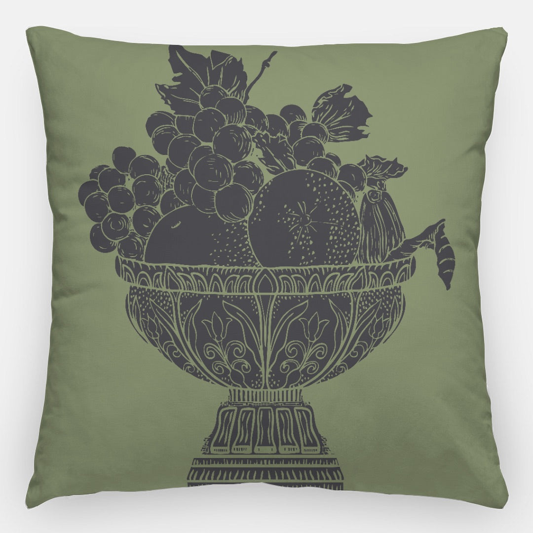 Rich with old-world charm and celebratory warmth, the Harvest Still Life Pillow brings a sense of abundance and tradition to your home. The front showcases a striking, hand-rendered illustration of an ornate compote overflowing with fruit—grapes, citrus, and gathered leaves—reminiscent of classical harvest engravings and antique still-life prints. Rendered in deep green against an olive background, the artwork feels both bold and timeless, offering a refined focal point for any space.