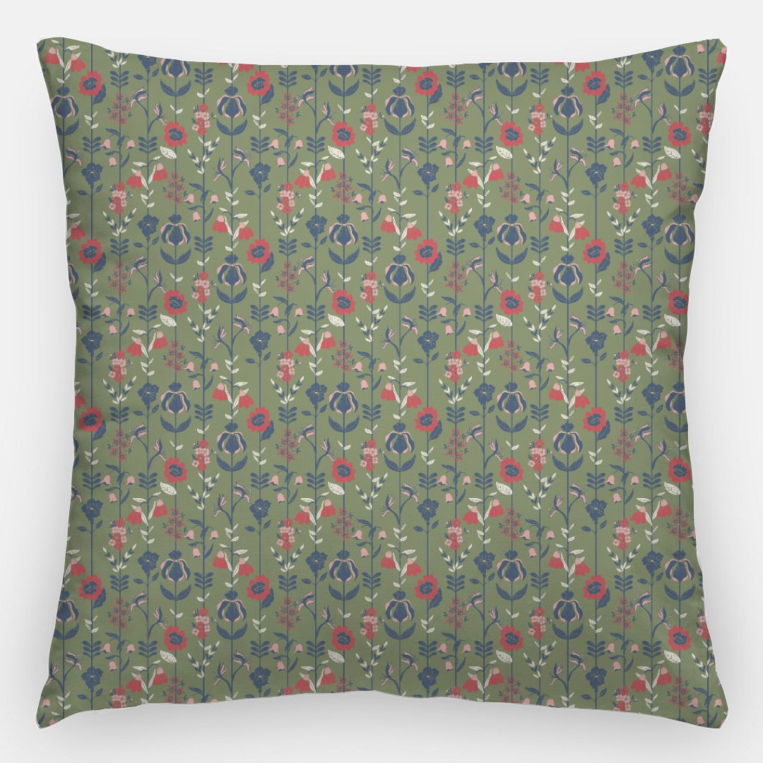 Rooted in tradition and reimagined for modern living, the Heirloom Garden Pillow pairs bold florals with delicate, lace-like detail for a beautifully layered look. The front features the Upright Garden pattern—an orderly arrangement of blooming flowers and leafy stems set against an olive ground. The vertical rhythm and warm, harvest-toned palette give the design a timeless, folk-inspired elegance that feels both structured and lively.