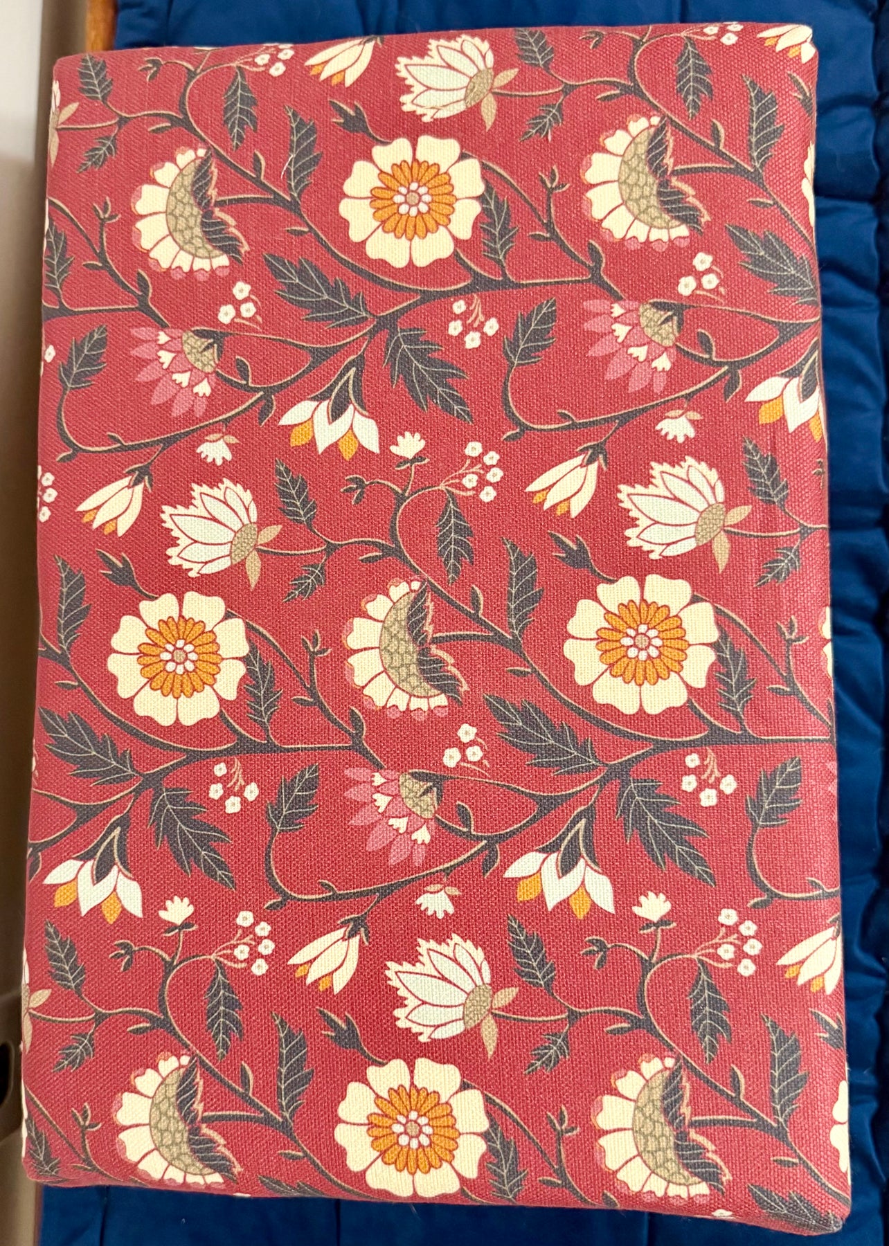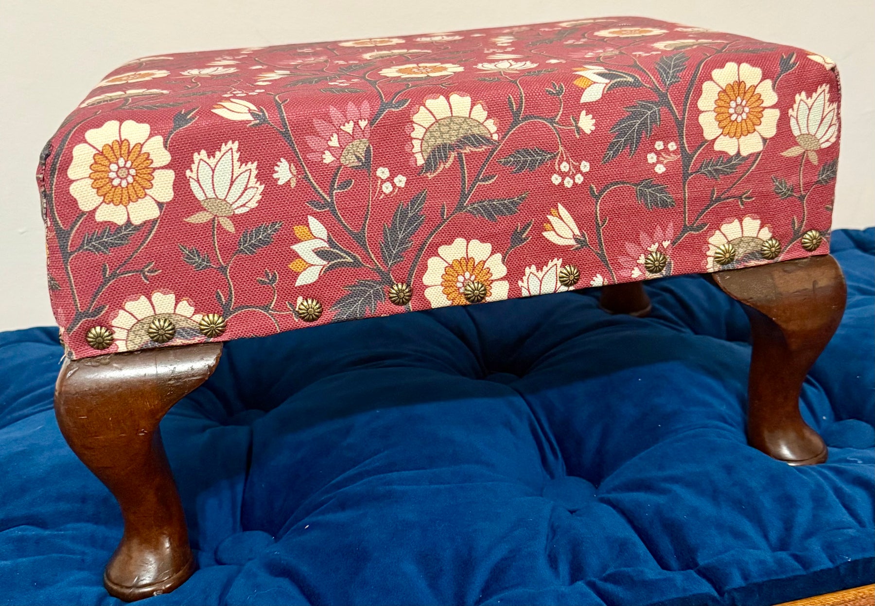 The top is finished in Lilyanne Design’s “Indian Floral” fabric, a richly patterned performance linen that brings a touch of timeless botanical beauty to any room. A 2" foam cushion wrapped in cotton batting provides comfort and structure, making this stool both practical and decorative.