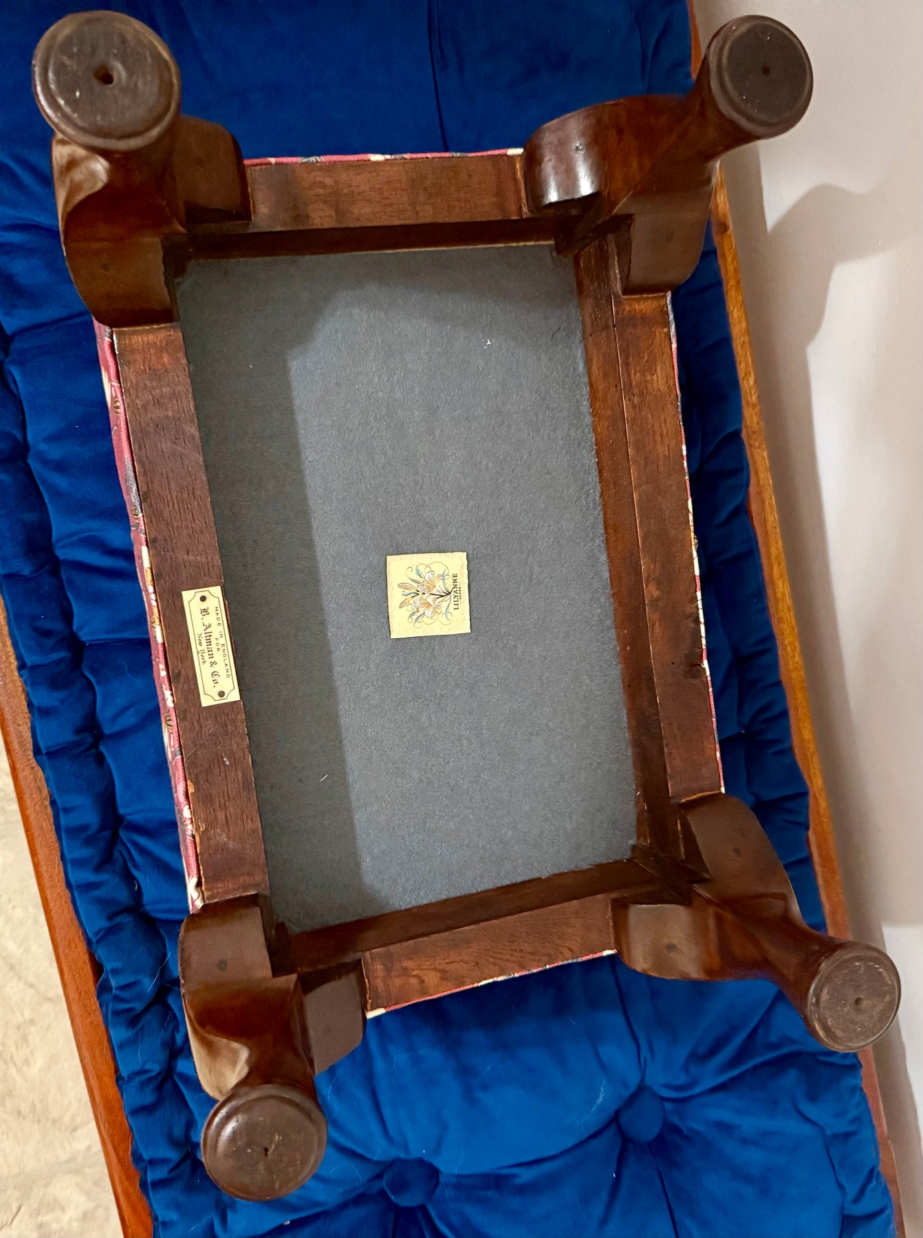 This elegant stool carries a piece of history into the modern home. Built on a hardwood antique base made in England for B. Altman & Co., it reflects timeless craftsmanship and heritage. The base has been carefully preserved, supporting a hand-stitched upholstered cushion that blends tradition with artistry.