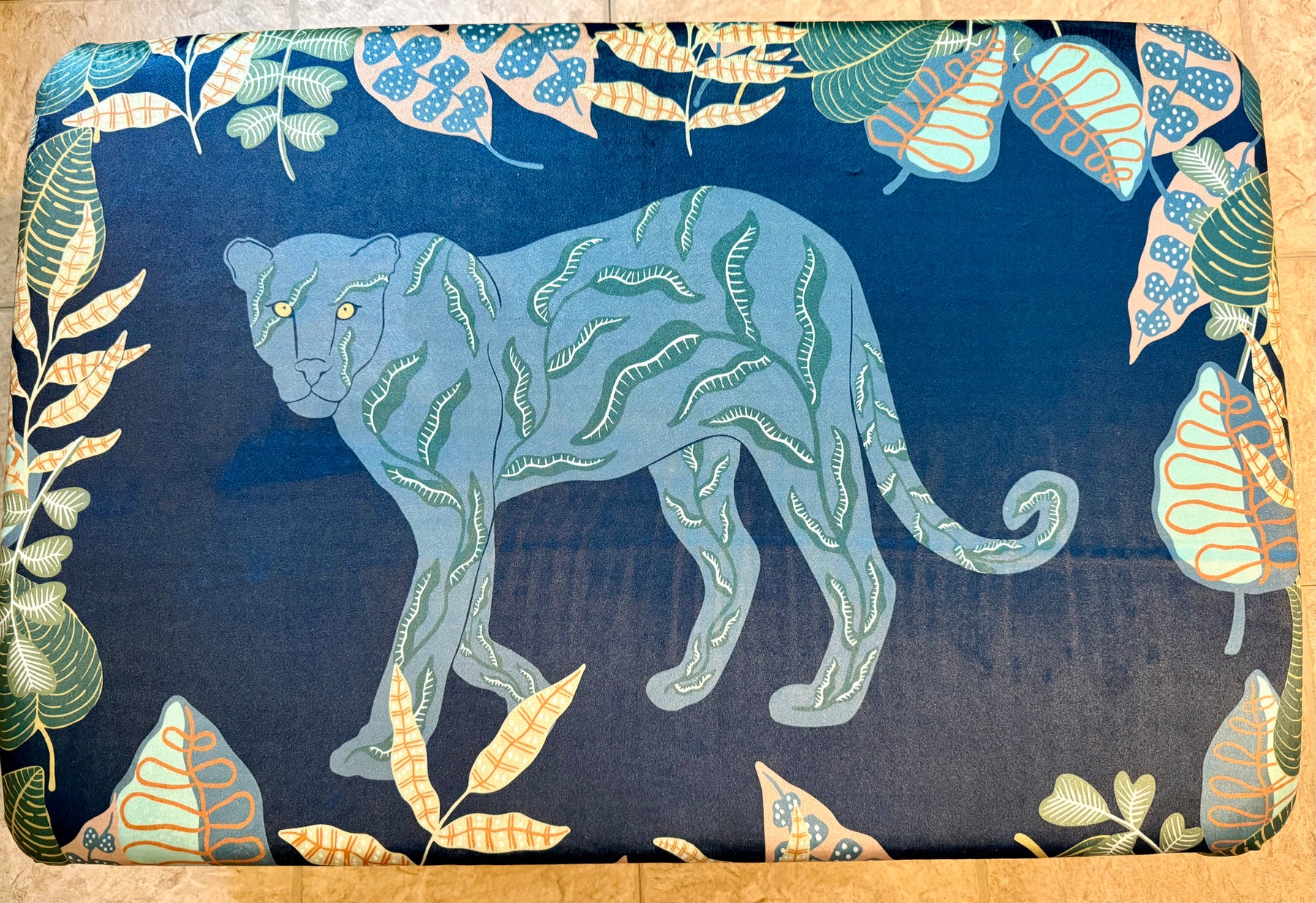Upholstered in Celosia Velvet, the cover showcases Lilyanne Design’s Jungle Flora pattern — a striking tableau of lush tropical leaves framing a stylized panther in teal hues against a deep sapphire ground. The edges are finished with satin rope trim, adding a refined, tailored detail.