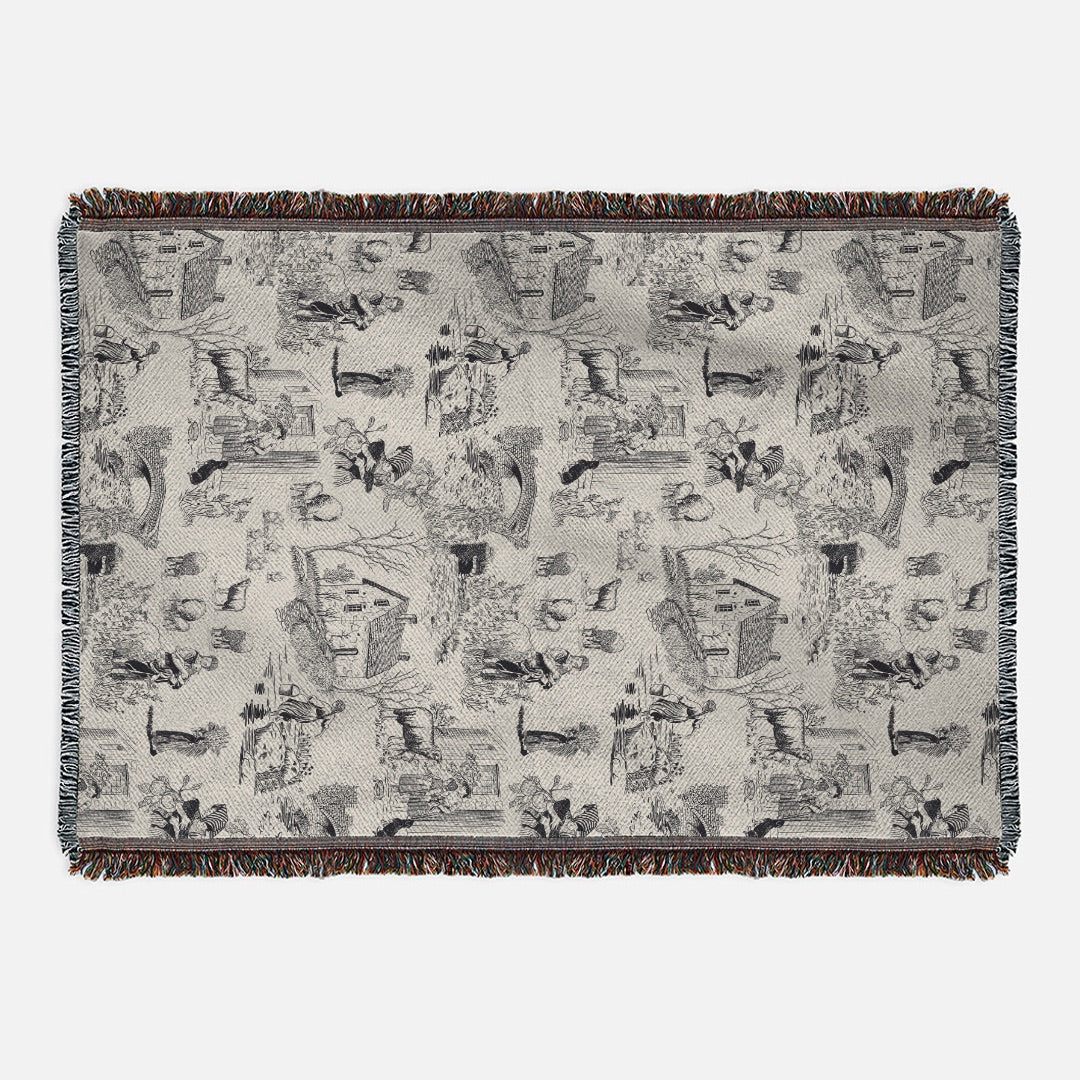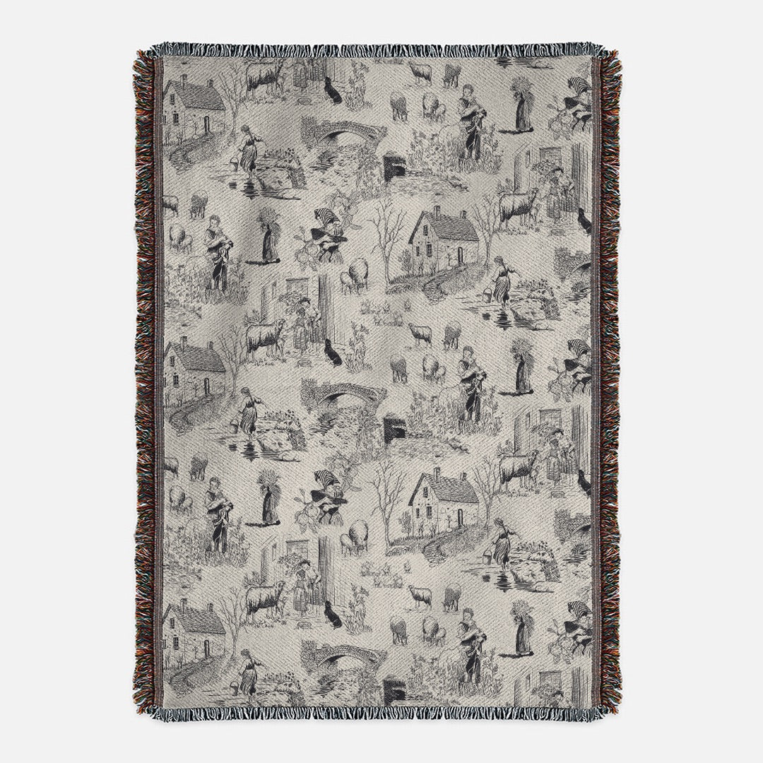 Wrap yourself in the gentle calm of the Quiet Countryside. This woven blanket features a tapestry-style rendering of the pastoral scenes from our beloved toile—rustic cottages, grazing sheep, winding streams, and tender everyday moments captured in timeless linework. It brings a touch of storybook nostalgia to any room while remaining beautifully understated and elegant.