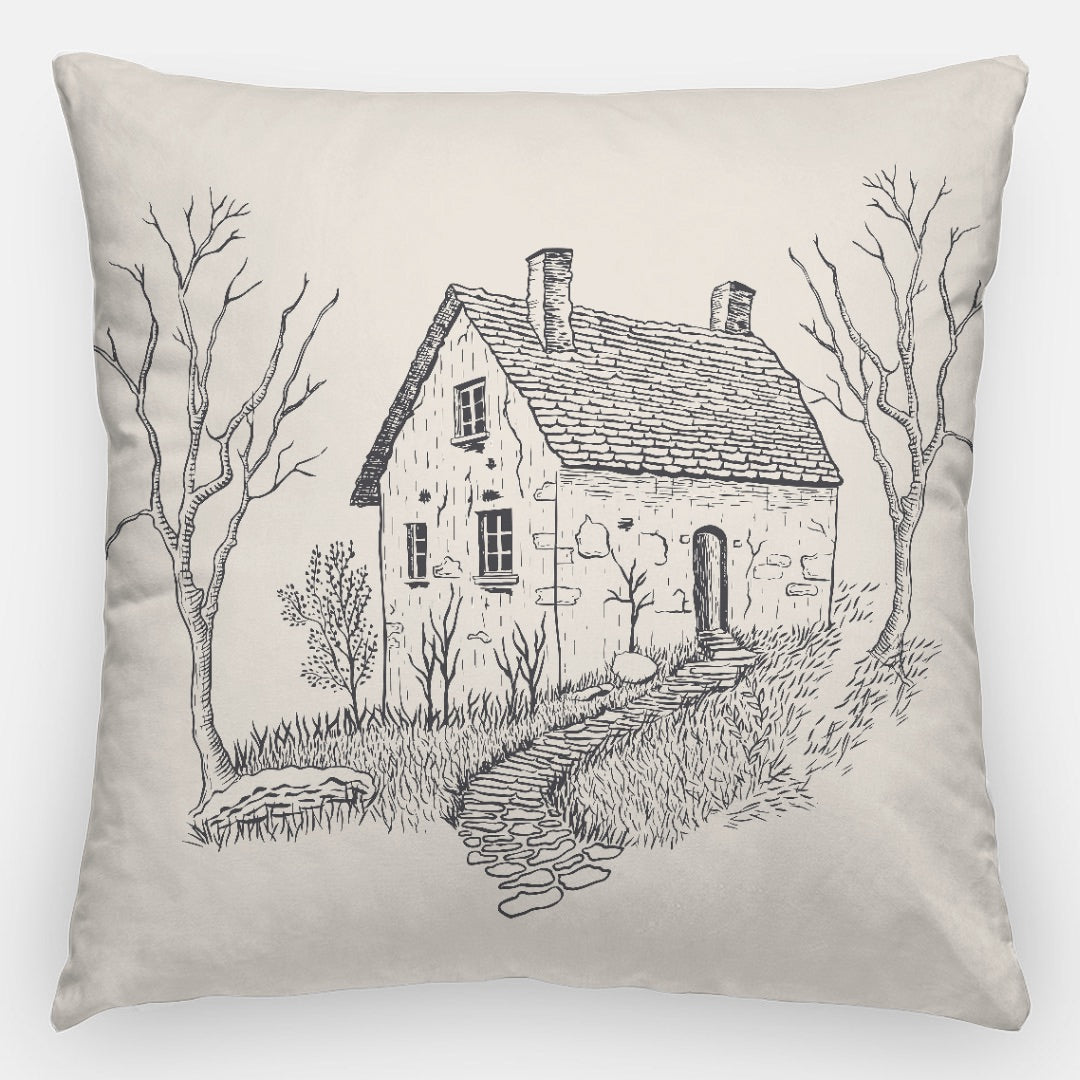 This artful 24" pillow pairs quiet storytelling with bold pattern play. The front features a hand-drawn pastoral illustration—an inviting cottage set among bare trees and winding paths—evoking a sense of calm, nostalgia, and slow living. Rendered in a refined, ink-style linework against a soft neutral ground, it feels timeless and contemplative, like a scene from a well-loved storybook.