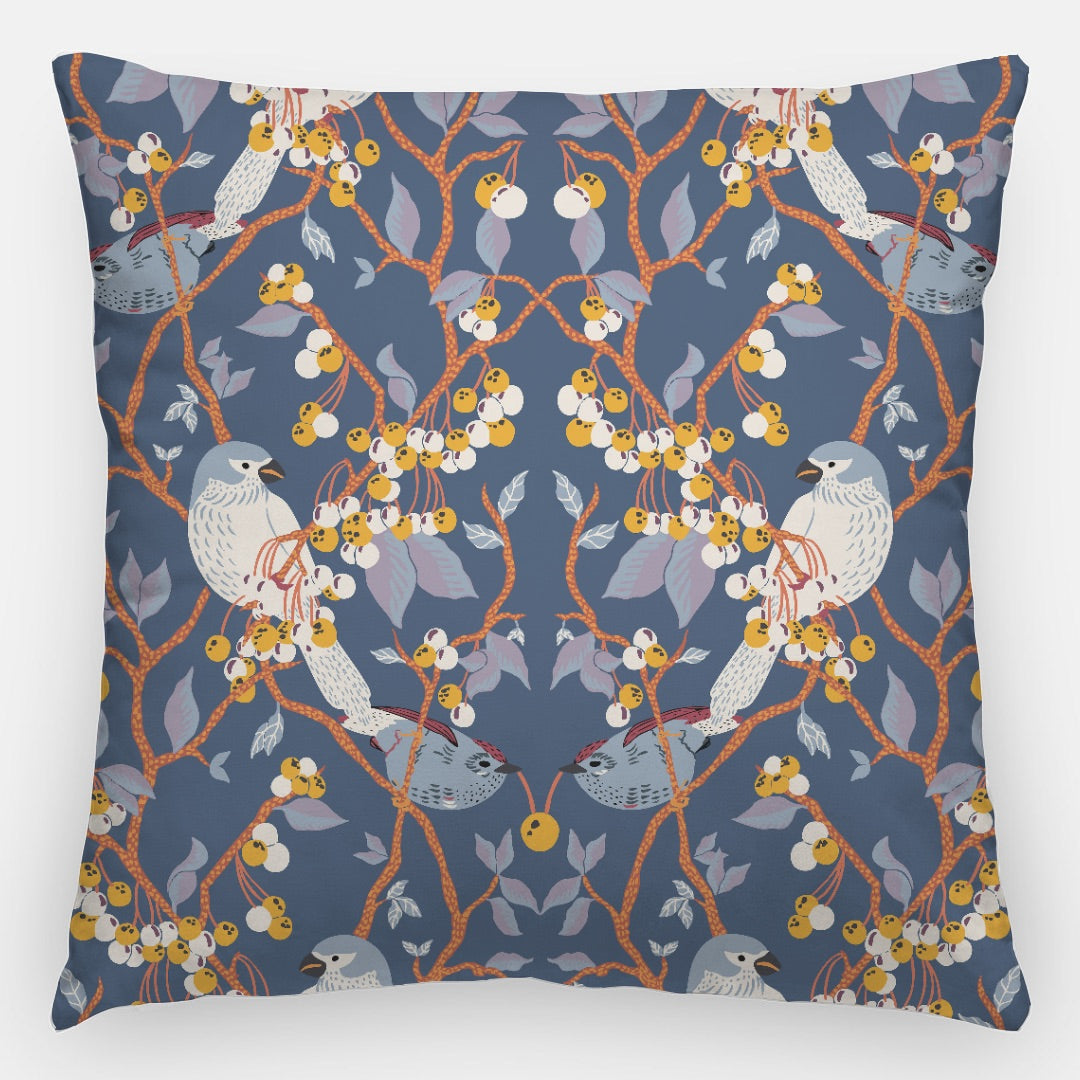 The reverse side is finished with the Hedgerow Chorus pattern, where stylized birds perch among twisting branches and berries in a rich slate blue palette. The contrast between the illustrative front and the rhythmic, decorative back makes this pillow perfect for flipping, layering, and mixing into a collected interior.