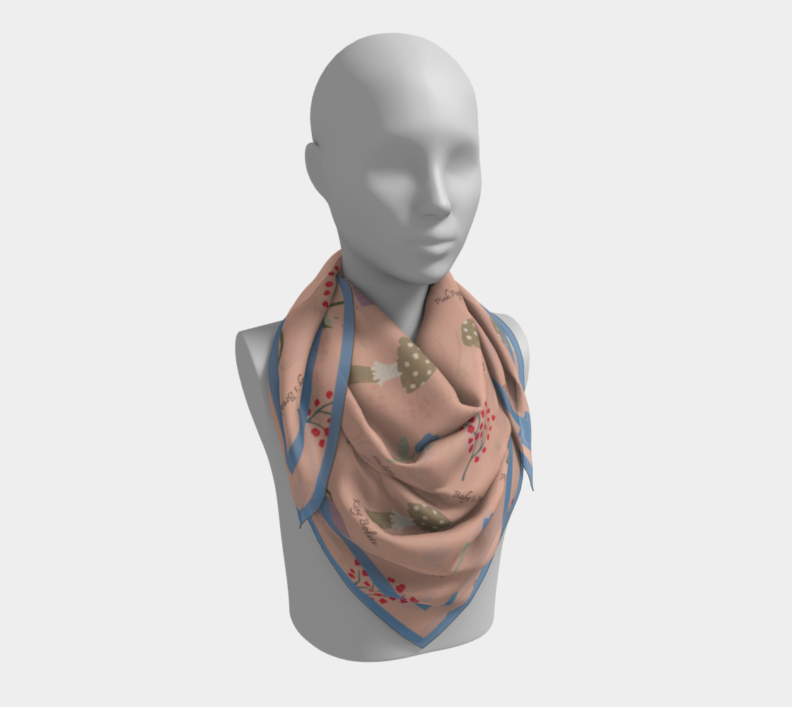 Delicate yet playful, our Field Guide scarf blends whimsical florals and spotted mushrooms with vintage-inspired charm. Featuring sweet pink poppies, baby’s breath, tulips, and King Bolete mushrooms, this design is scattered across a soft peach ground with hand-lettered names adding a field-journal feel. The coordinating blue border adds a polished touch.