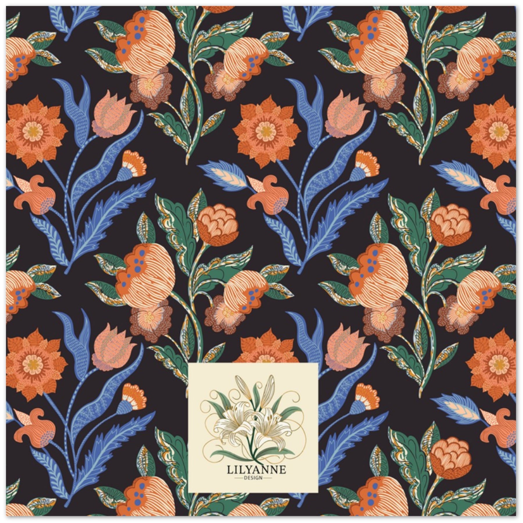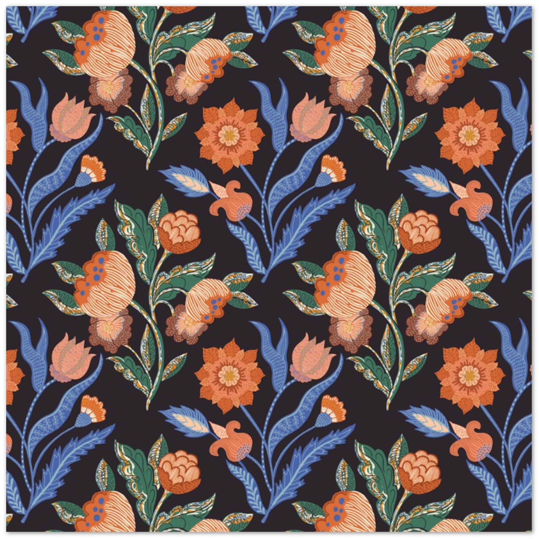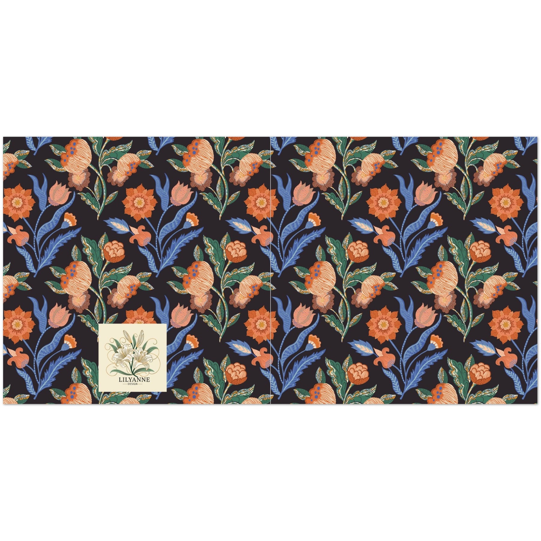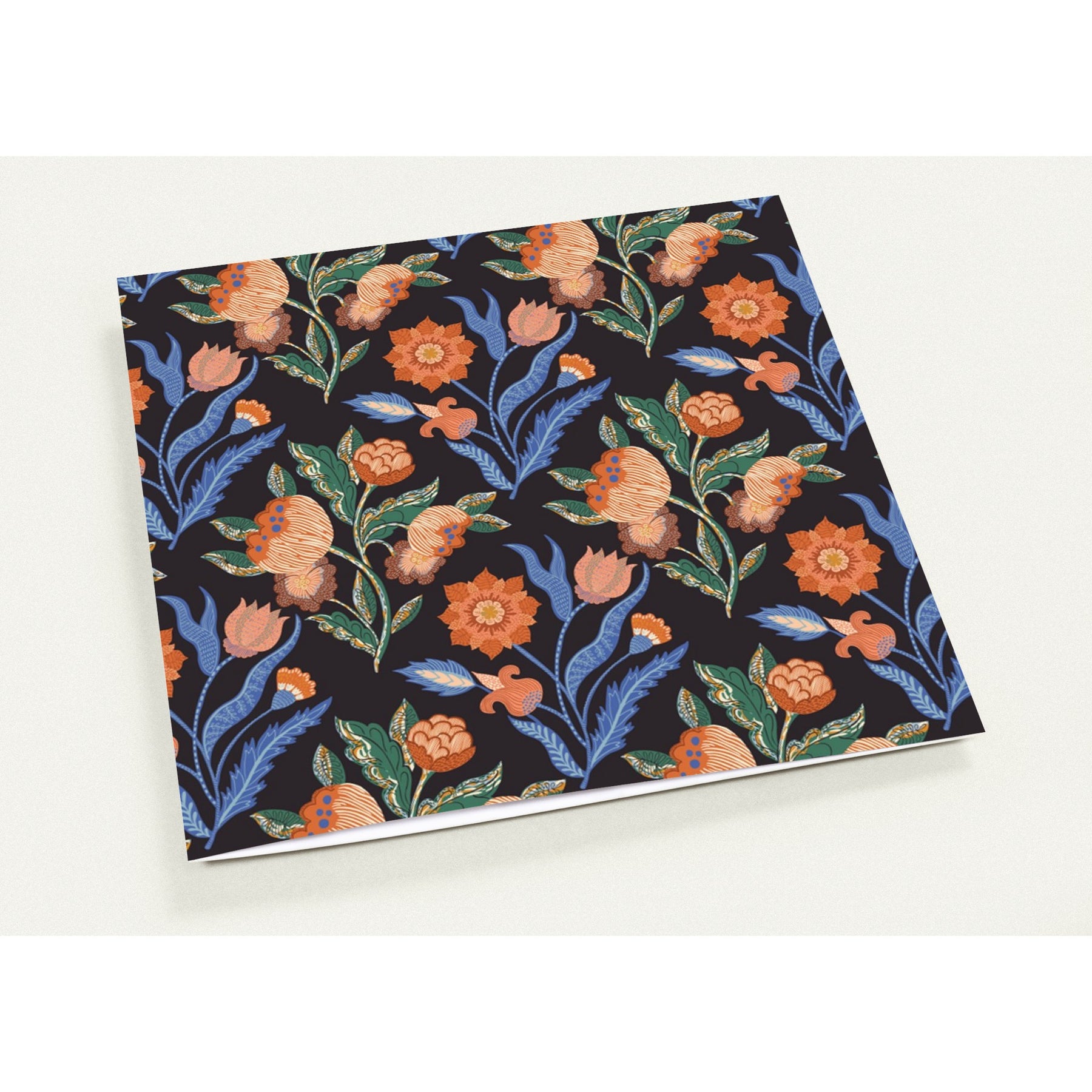 Infuse every message with the whimsical charm of this intricate and bold floral design. These personalized folded greeting cards feature a stunning bohemian floral pattern, perfect for adding a touch of vintage elegance to any occasion. The rich palette of rust oranges, deep blues, and lush greens against a dark background evokes a sense of timeless sophistication, ensuring your sentiments are delivered with distinctive style.
