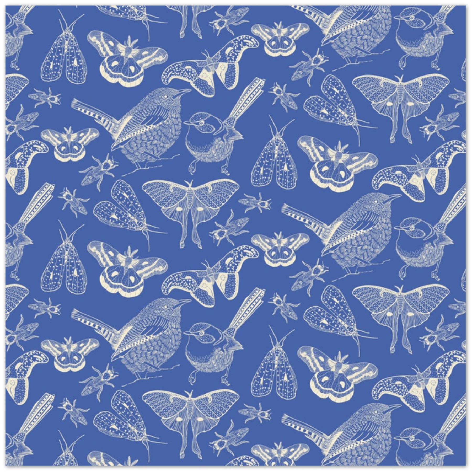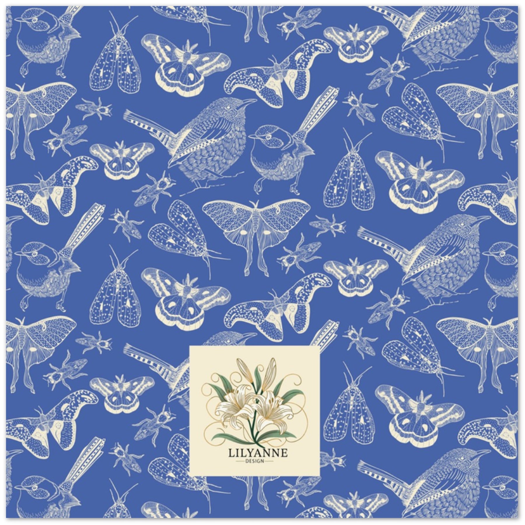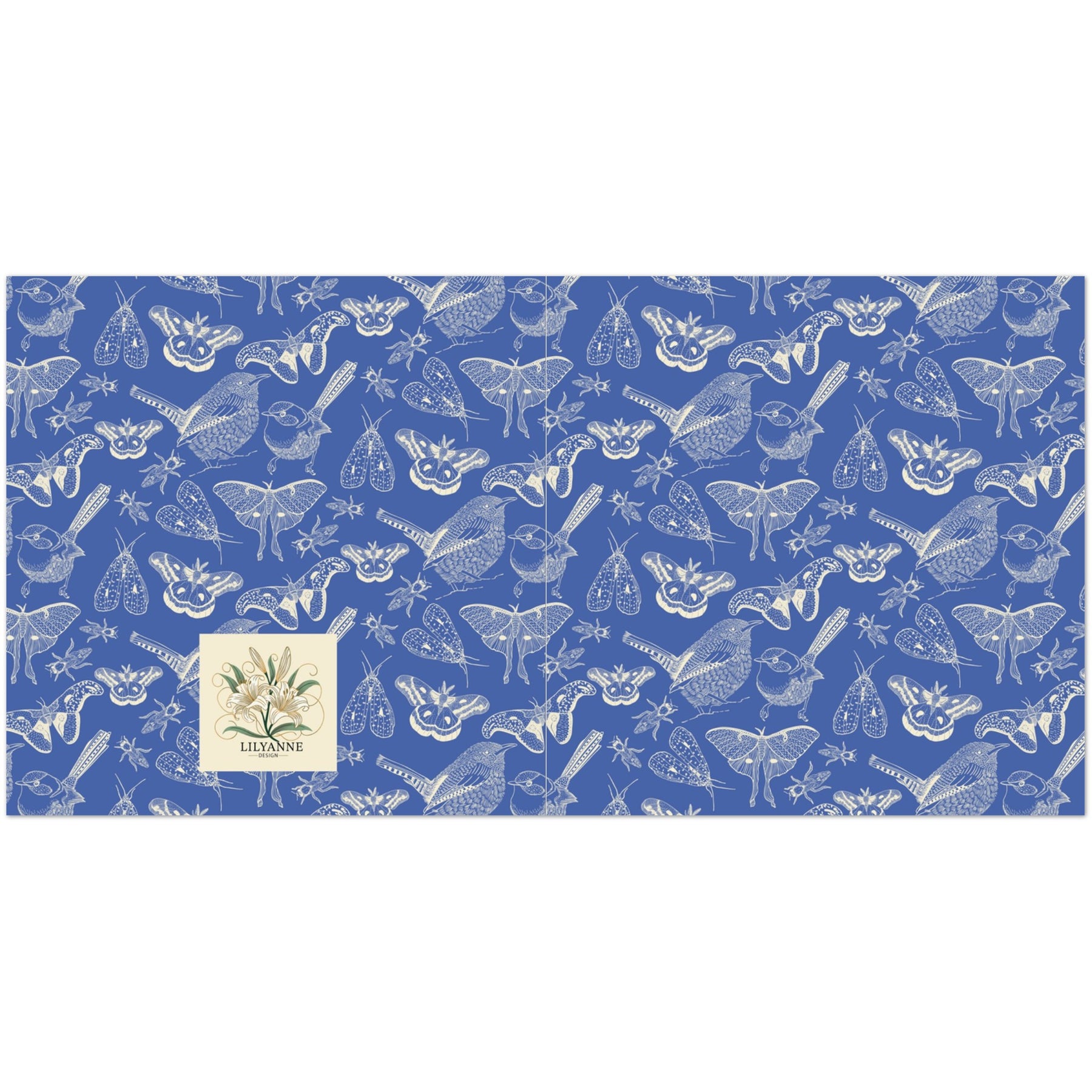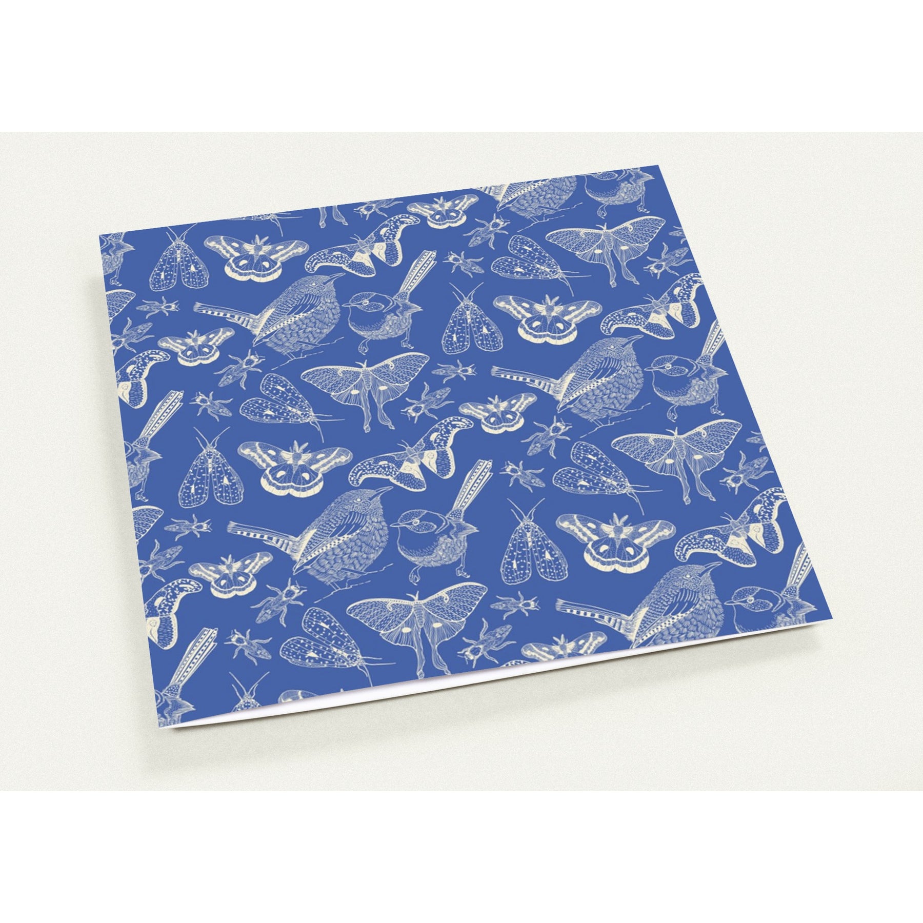 Send a touch of timeless elegance with these personalized folded greeting cards, featuring an enchanting botanical pattern of delicate moths, graceful birds, and intricate insects against a calming blue backdrop. Perfect for anyone who appreciates nature-inspired artistry and a sophisticated aesthetic, these cards transform every message into a memorable keepsake.