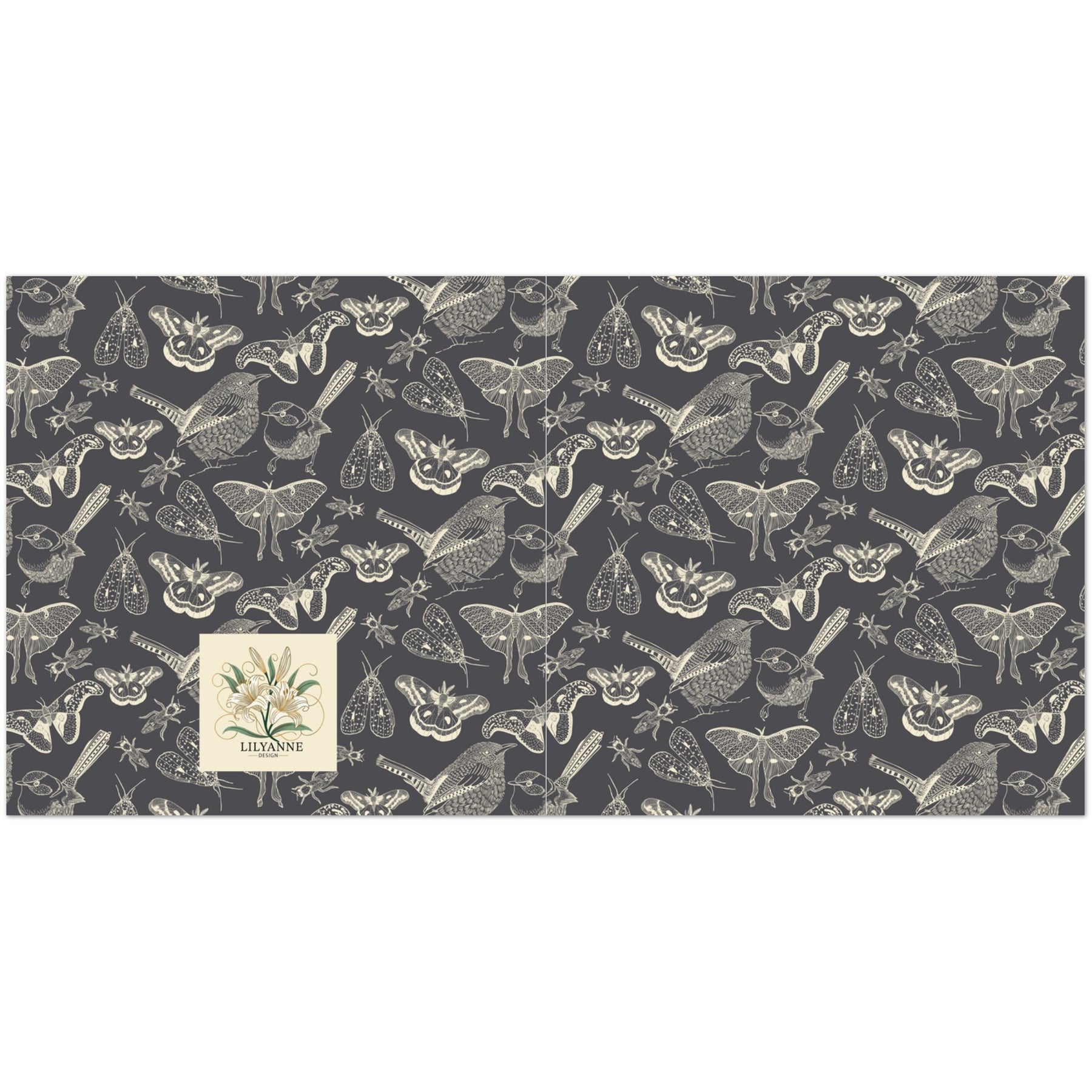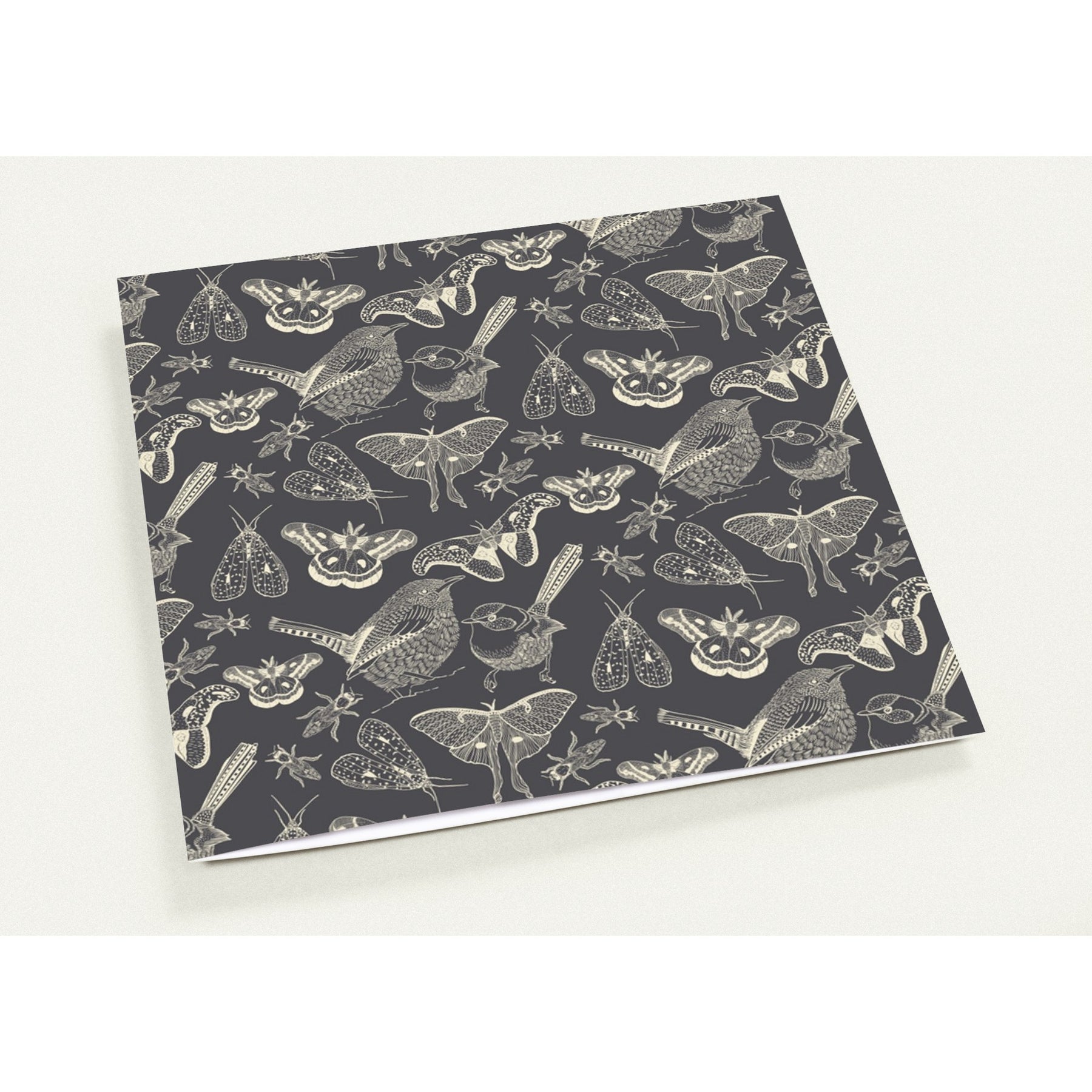 Bring a touch of enchanting nature to your heartfelt messages with these hand drawn folded greeting cards. Featuring a captivating nature-inspired pattern of intricate moths, delicate birds, and charming insects against a rich, dark background, these cards evoke a sense of vintage elegance and serene wilderness. Perfect for any occasion, from thoughtful notes to grand celebrations, your sentiments will be beautifully delivered with a unique artistic flair.