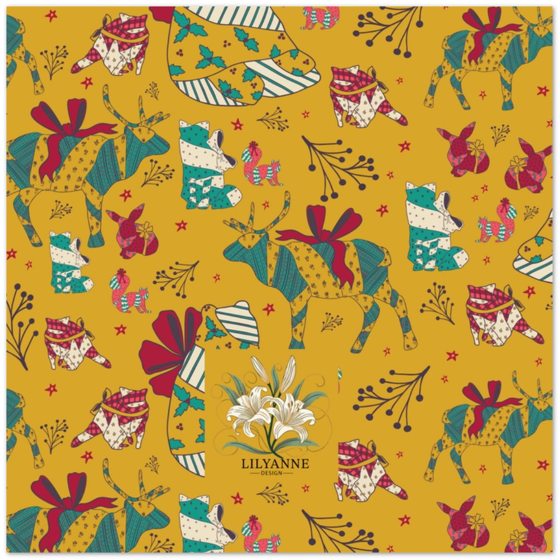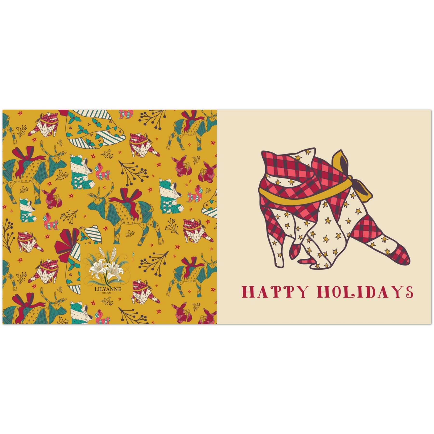 Celebrate the season with this charming Wrapped Up Animals Greeting Card Set by Lilyanne Design. Featuring whimsical woodland creatures wrapped in cozy holiday prints, this cheerful design is perfect for spreading warmth and joy.
